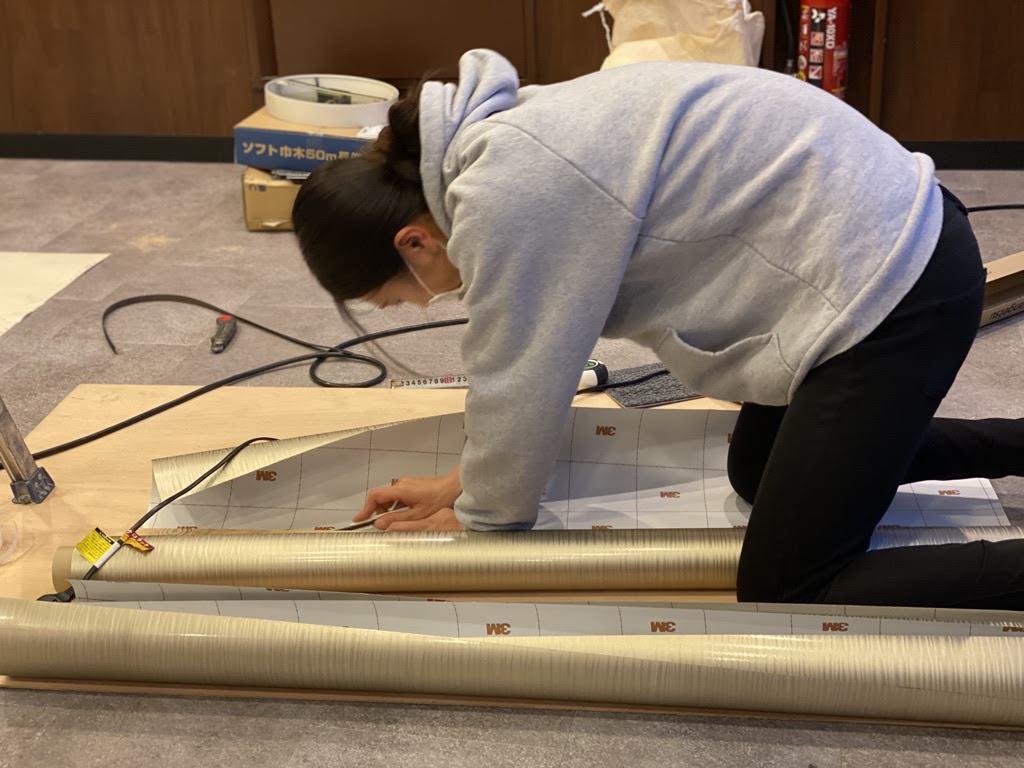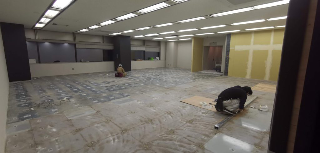 床張りは大変なんです!腰が痛い! やっとできた~!大会議室を貼り終えたぞ! もちろんプロの職人さんに来てくれて教えてもらいましたよ!