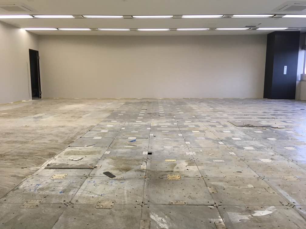 このOAフロア穴だらけで大変だったんです!穴をふさぐものがすでに廃盤になっていてないんです!ないなら自分たちで作りましょうってことで手作業で板を研磨して作りましたよ!